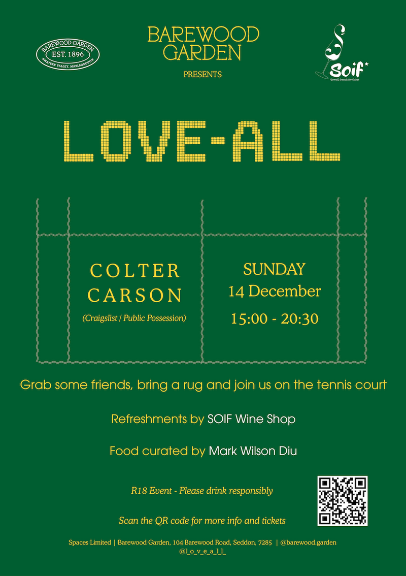 Sunday 14 Dec 3-830pmJoin Us on the tennis court for an afternoon of great local drinks, food and soundtrack provided by Colter Carson.